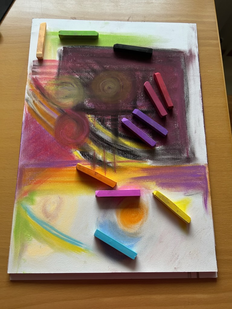 Henkilökohtainen väritulkinta pastellivärein. Katson intuitiivisesti mitä eteeni laitetaan ja mitä näytetään. Värit, muodot ja kuviot kertovat. Näytän piirtäen mitä tulee esiin.
